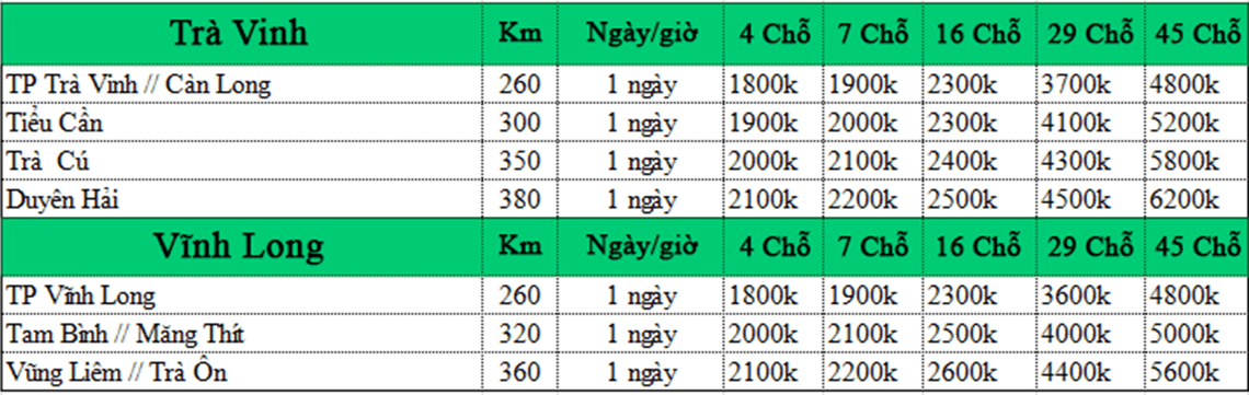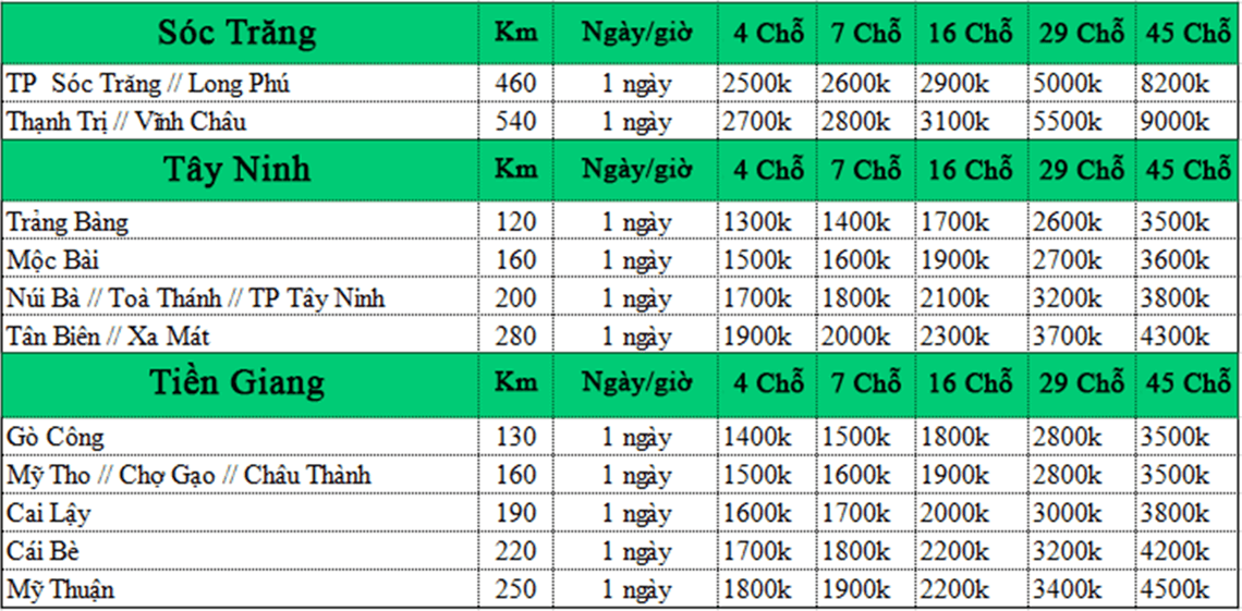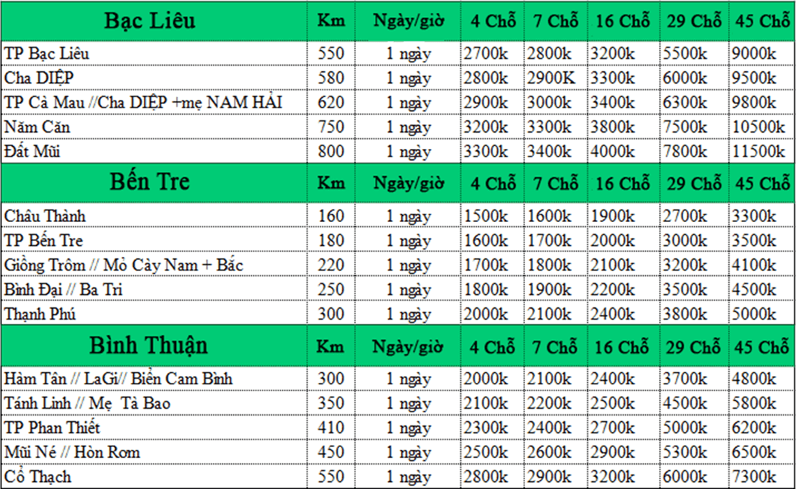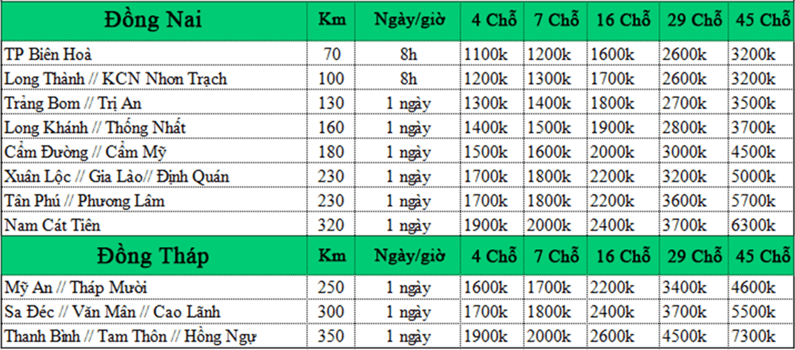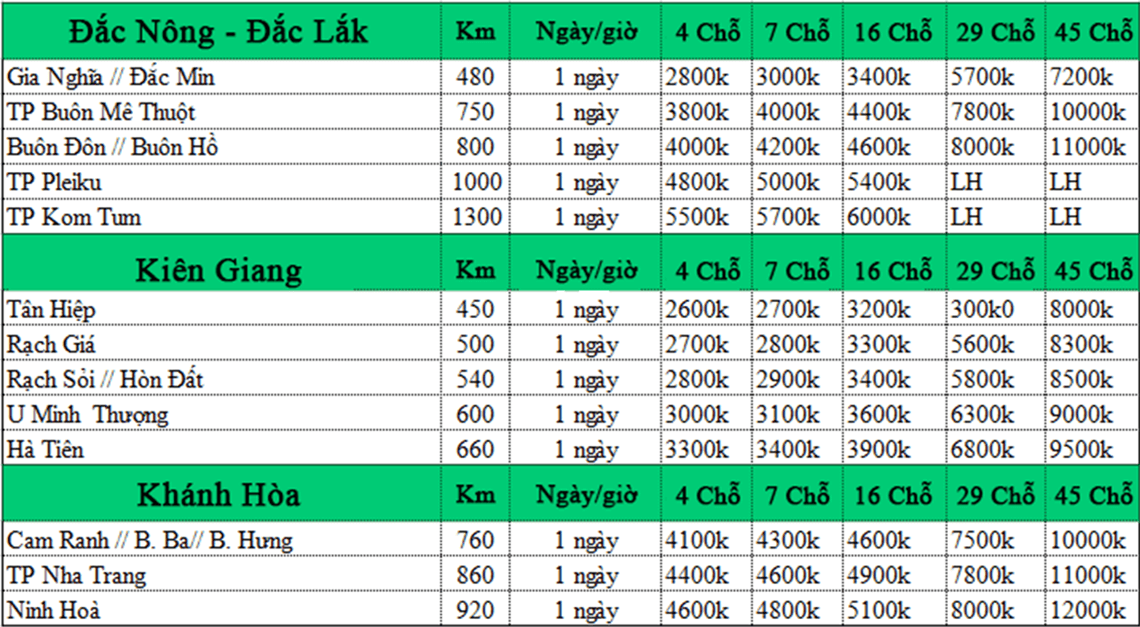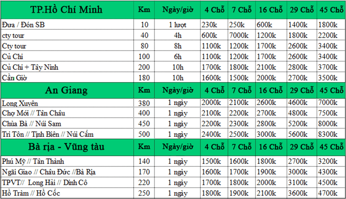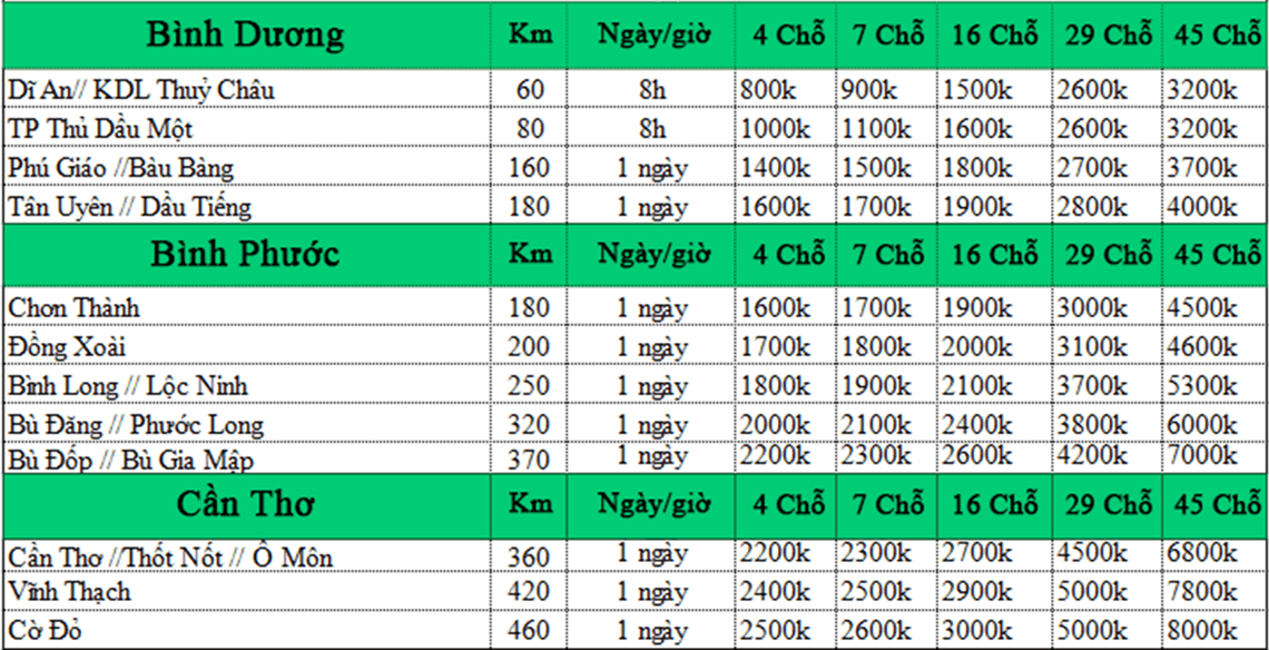 BẢNG BÁO GIÁ CHO THUÊ XE TẠI DỊCH VỤ XE DƯƠNG LỘC